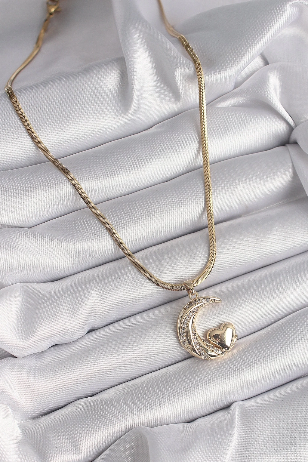 316L Çelik Gold Renk Çelik İtalyan Zincir Zirkon Taşlı Halil Figür Kalp Detay Kadın Kolye