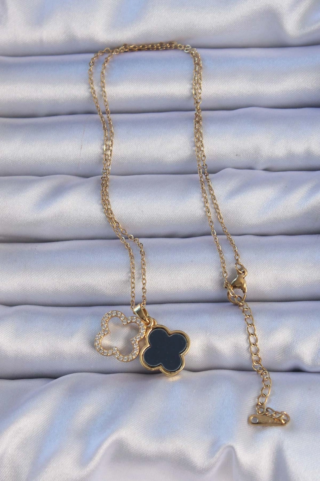316L Çelik Gold Renk Siyah Mineli Zirkon Taşlı Yonca Figürlü Kolye