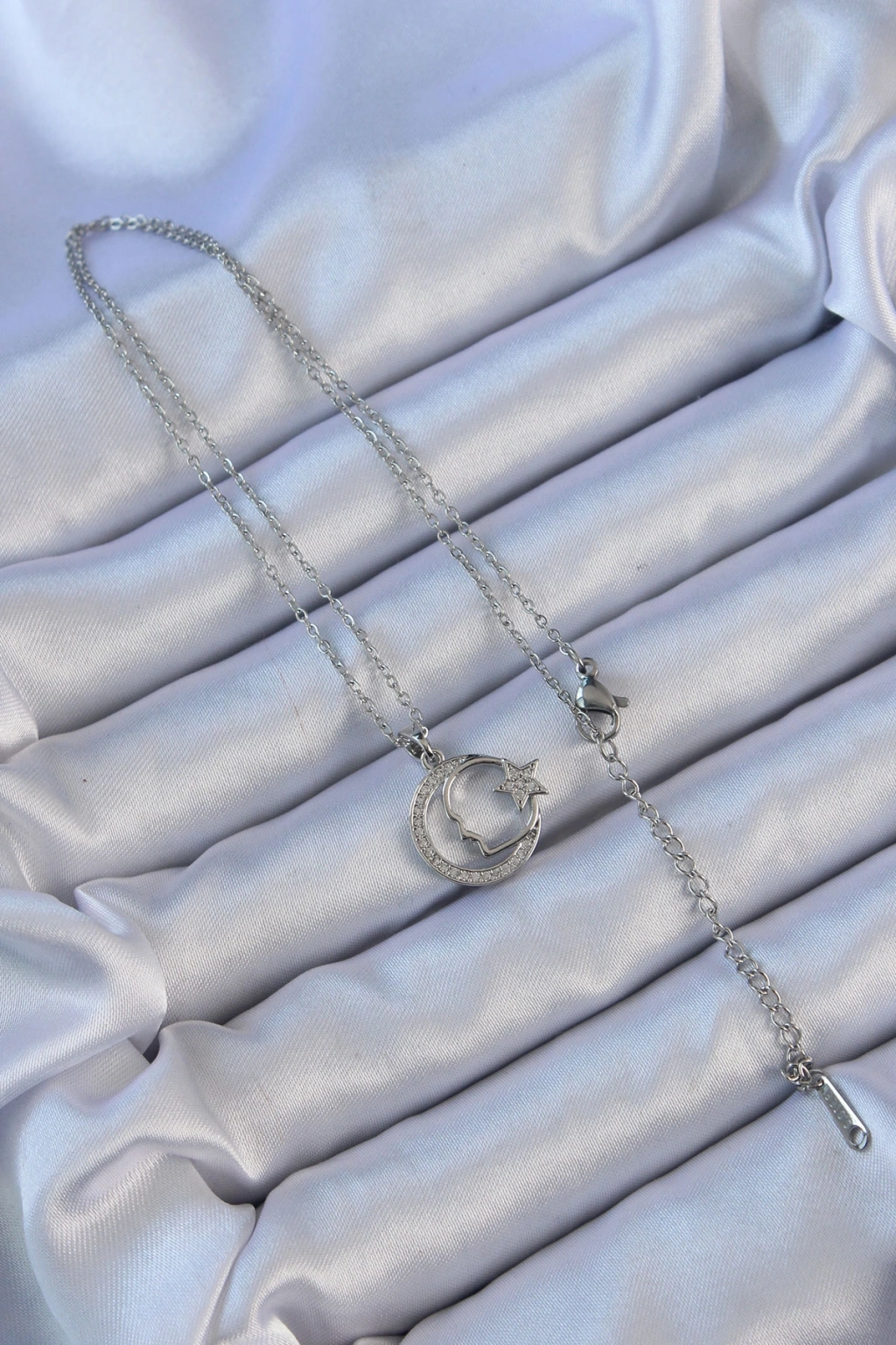 316L Çelik Zincir Gümüş Renk Zirkon Taşlı Ay Yıldız Simgeli Atatürk Kolye