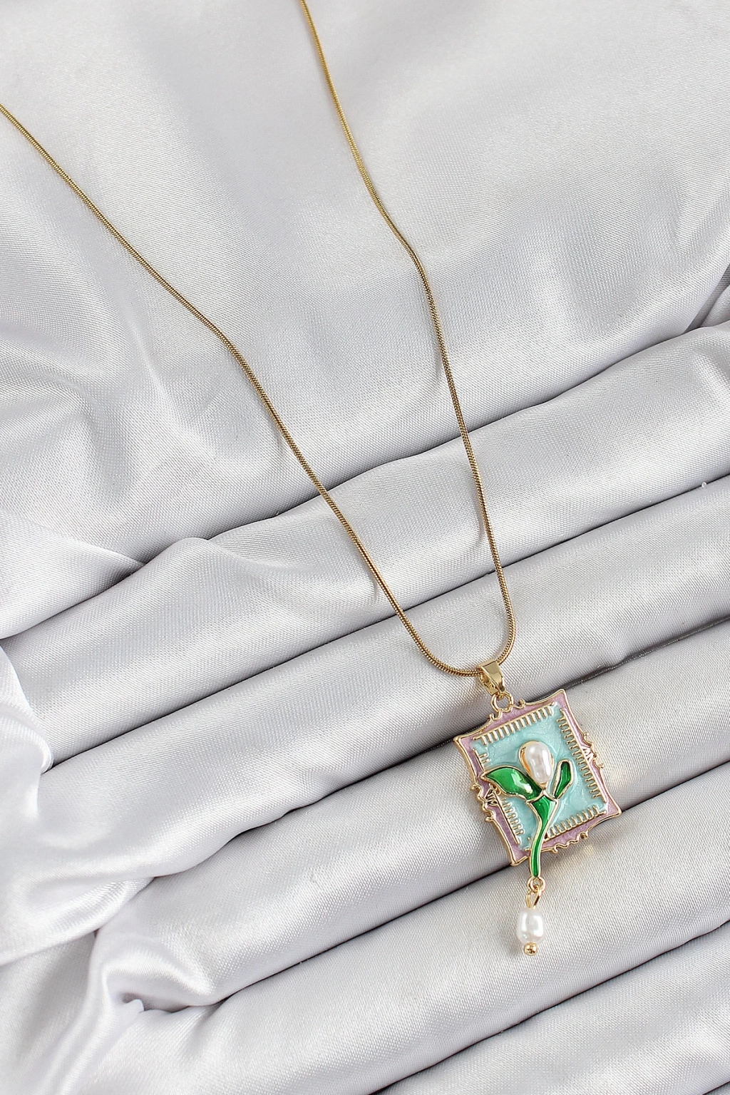 316L Çelik Zincir Turkuaz Sanatsal Portre Sallantılı İnci Detaylı Lale Model Gold Renk Kadın Kolye