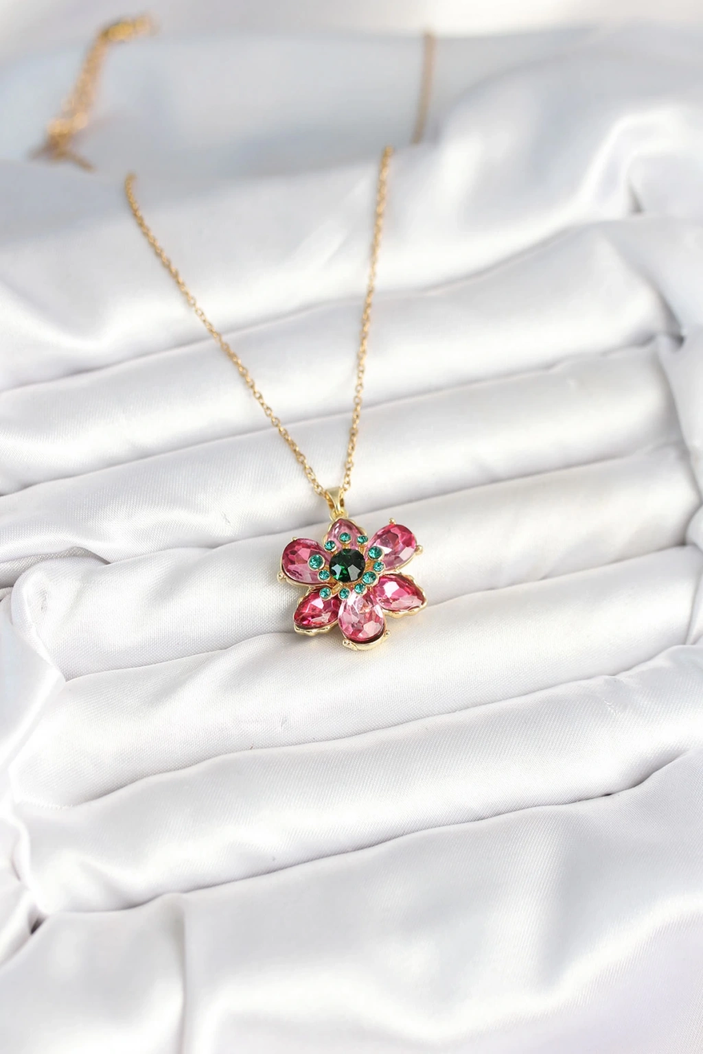 316L Çelik Zincirli Pembe Çiçek Model Kadın Kolye