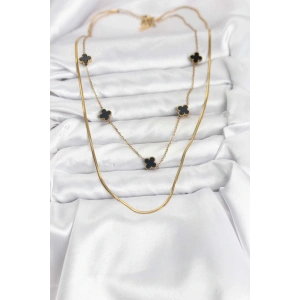 316L Çelik Zincir Gold Renk İtalyan Zincirli Siyah Yonca Model Kadın Kolye
