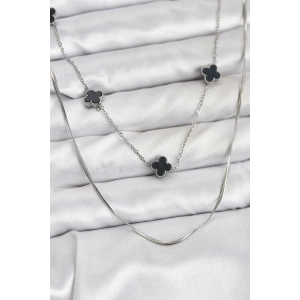 316L Çelik Zincir Gümüş Renk İtalyan Zincirli Siyah Yonca Model Kadın Kolye