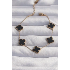 316L Çelik Gold Renk Zirkon Taş Aksesuarlı Siyah Mineli Yonca Bileklik