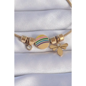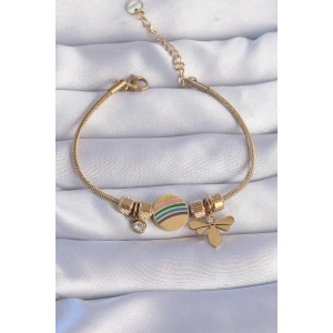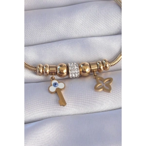 316L Çelik Gold Renk Zirkon Taşlı Yonca Detay Nazarlı Anahtar Tasarımlı Bileklik
