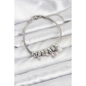 Pirinç Gümüş Renk Kalpli Model Charmlı Kadın Bileklik