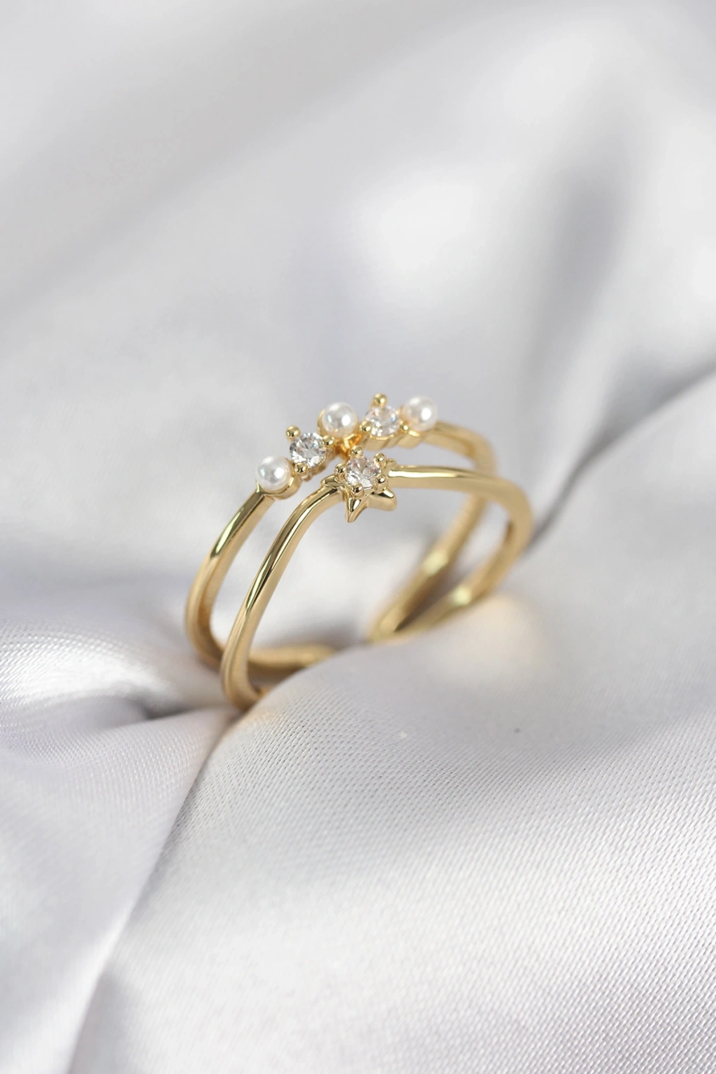 Gold Renk İncili Yıldız Model Zirkon Taşlı Kadın Yüzük