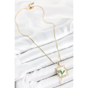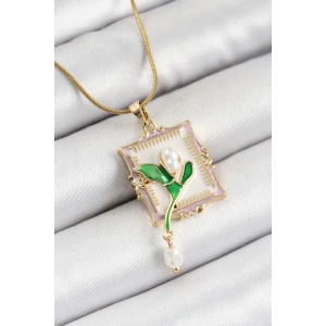 316L Çelik Zincir Beyaz Sanatsal Portre Sallantılı İnci Detaylı Lale Model Gold Renk Kadın Kolye