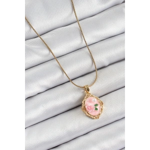 316L Çelik Zincir Pembe Sanatsal Portre İnci Detaylı Gül Figürlü Model Gold Renk Kadın Kolye