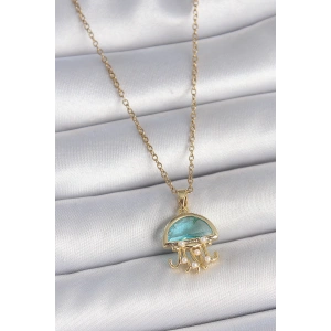 316L Çelik Gold Renk Mavi Taşlı Deniz Anası Model İnci Detay Kadın Kolye