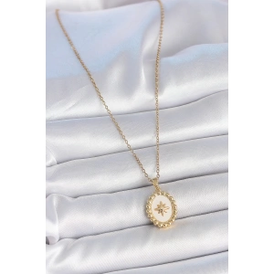 316L Çelik Gold Renk Zincir Beyaz Mineli Kutup Yıldız İşlemeli Madalyon Model Kadın Kolye