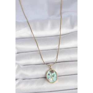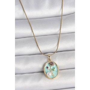 316L Çelik Gold Renk Zincir Mavi Çiçek İşlemeli İnci Detay Portre Model Kadın Kolye