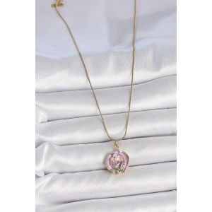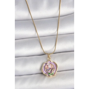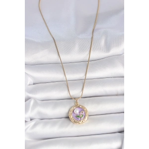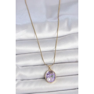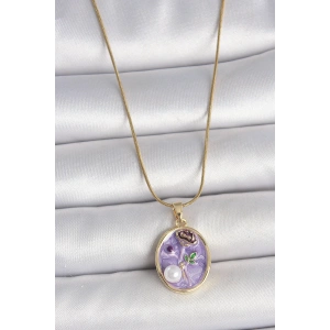 316L Çelik Gold Renk Zincir Mor Çiçek İşlemeli İnci Detay Potre Model Kadın Kolye