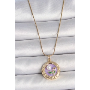 316L Çelik Gold Renk Zincir Mor Çiçek İşlemeli İnci Detay Portre Model Kadın Kolye