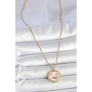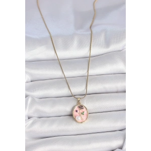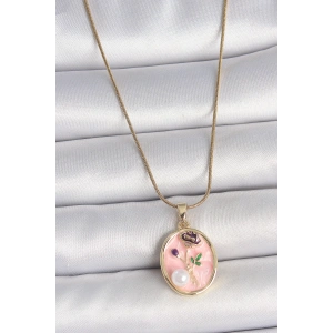 316L Çelik Gold Renk Zincir Pembe Çiçek İşlemeli İnci Detay Portre Model Kadın Kolye