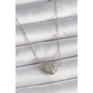 316L Çelik Gümüş Renk Zirkon Taşlı Mıknatıslı Kalp Model Kadın Kolye