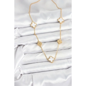316L Çelik Zincir Gold Renk Beyaz ve Zirkon Taşlı Yonca Kadın Kolye