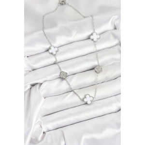 316L Çelik Zincir Gümüş Renk Beyaz ve Zirkon Taşlı Yonca Kadın Kolye