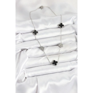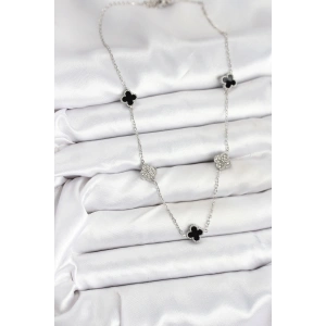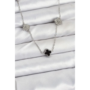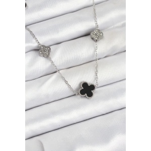 316L Çelik Zincir Gümüş Renk Siyah ve Zirkon Taşlı Baby Boy Yonca Kadın Kolye