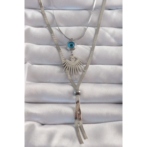 316L Çelik Gümüş Renk Zirkon Taşlı Göz Detay Nazarlı Uzun Asansör Model Kolye