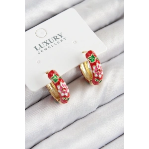 Pirinç Gold Renk Kırmızı Çiçek İşleme Mineli Kadın Küpe