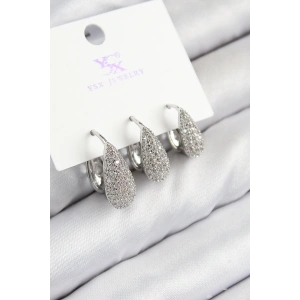 Pirinç Zirkon Taşlı 3'lü Damla Model Gümüş Renk Kadın Küpe