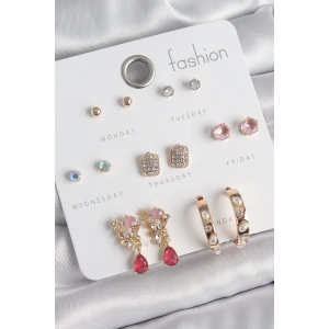 Pirinç Gold Renk Zirkon Taşlı Çiçek Figür İncili Halka Figür 7 Çift Kadın Küpe Seti
