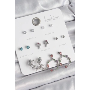 Pirinç Gümüş Renk Zirkon Taşlı Damla Model Çiçek Detay 7 Çift Kadın Küpe Seti