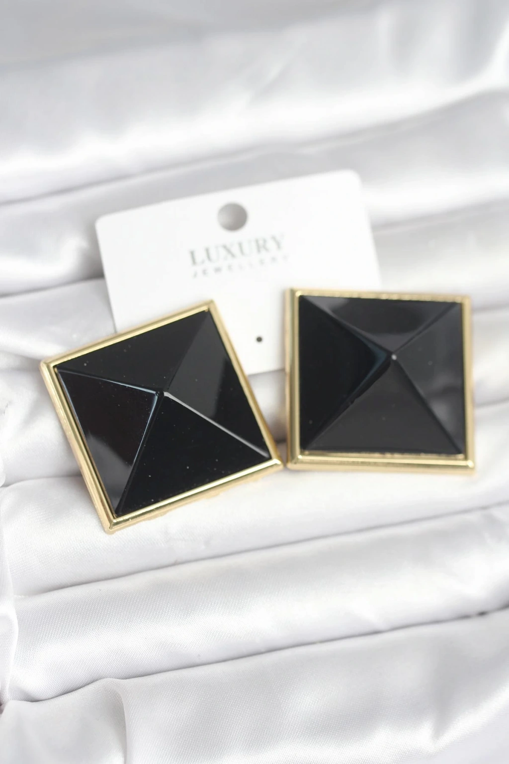 Pirinç Gold Renk Siyah Piramit Model Kadın Küpe