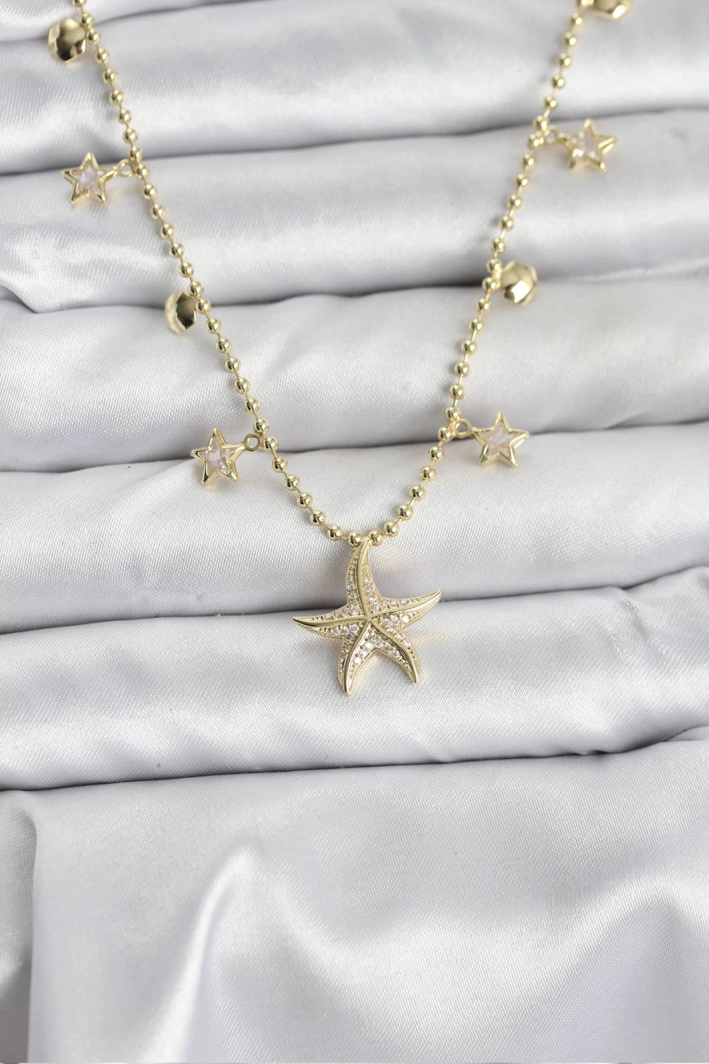 Pirinç Gold Renk Zirkon Taşlı Deniz Yıldızı Model Kadın Kolye