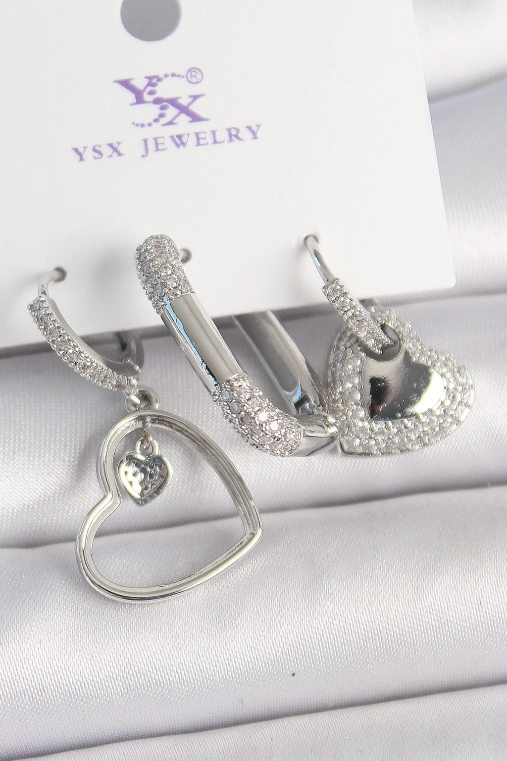 Pirinç Gümüş Renk Sallantı Zirkon Taşlı Kalp Model 3'Lü Kadın Kombin Küpe