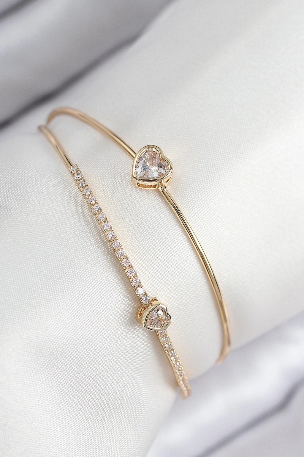 Pirinç Zirkon Taşlı Kalp Model Gold Renk Kadın Bileklik