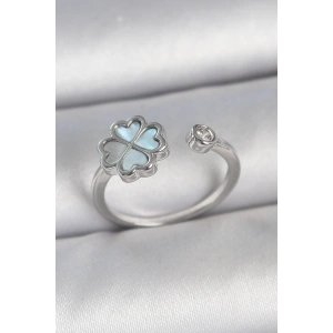 Pirinç Gümüş Renk Mavi Mineli Yonca Model Zirkon Taş Detay Ayarlanabilir Kadın Yüzük