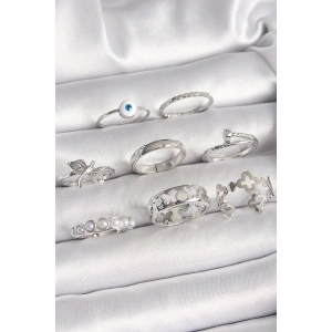 Pirinç Gümüş Renk Nazar Boncuk Detay İncili Kelebek İşlemeli Kadın Yüzük Kombini