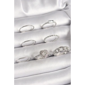 Pirinç Gümüş Renk Zirkon Taşlı Kalp Model Kadın Yüzük Kombini