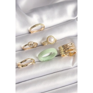 Pirinç Gold Renk Daire 3D İncili Figür Zincir Model Gül İşleme Detaylı 6'Lı Kadın Yüzük Seti
