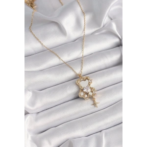316L Çelik Gold Renk Zincir Zirkon Taş Detaylı Beyaz Sedefli Ay Yıldız Model Kadın Kolye