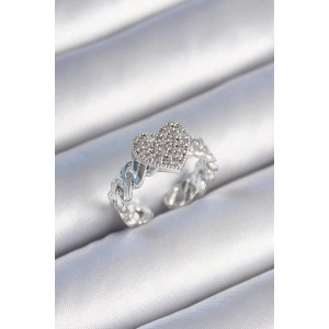 Pirinç Gümüş Renk Zincir Kordon Zirkon Taşlı Kalp Model Kadın Yüzük