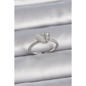 Pirinç Gümüş Renk Zirkon Taşlı Kalp İnci Detay Ayarlanabilir Model Kadın Yüzük