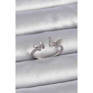 Pirinç Gümüş Renk Ayarlanabilir Zirkon Taşlı Kelebek Model Kadın Yüzük
