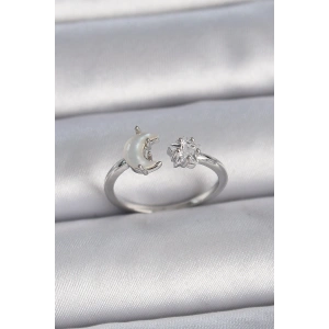 Pirinç Gümüş Renk İncili Hilal Zirkon Taşlı Yıldız Ayarlanabilir Kadın Yüzük