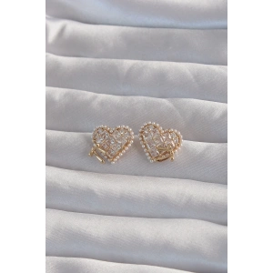 Pirinç Gold Renk Fiyonk Detay İncili Zirkon Taşlı Kalp Küpe