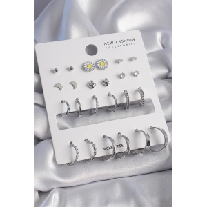 Pirinç Gümüş Renk Papatya Detaylı 12 Çiftli Kadın Küpe Seti