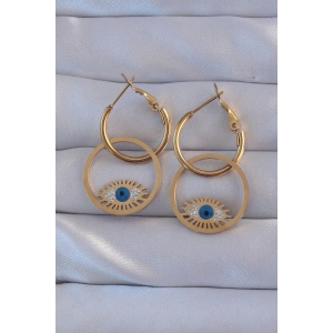 316L Çelik Gold Renk Zirkon Taşlı Mavi Göz Tasarımlı Halka Küpe
