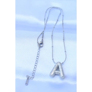 316L Çelik Zincirli Zirkon Taşlı A Harfli Gümüş Renk Bubble Kolye