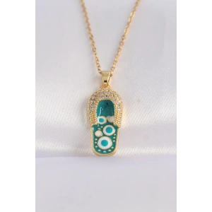 316L Çelik Zincir Zirkon Taşlı Altın Renk Nazarlı Terlik Tasarımlı Kolye