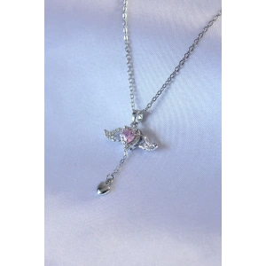 316L Çelik Gümüş Renk Kanatlı Kalp Figür Zirkon Taş Detay Kadın Kolye