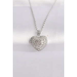 316L Çelik Zincir Gümüş Renk Zirkon Taşlı Kalp Kolye