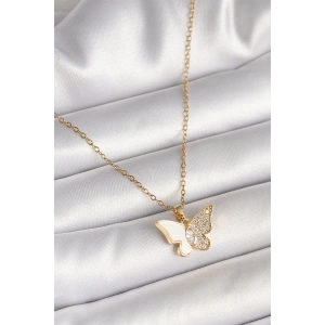 316L Çelik Gold Renk Zincir Zirkon Taşlı Beyaz Mineli Kelebek Model Kadın Kolye