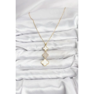 316L Çelik Zincir Gold Renk Yonca Detaylı Zirkon Taşlı Kadın Kolye